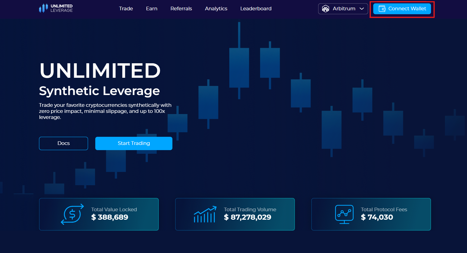 **Step 2:** Select the "Connect Wallet" button on the top right of the Unlimited Leverage home screen (marked in red), as seen below.
