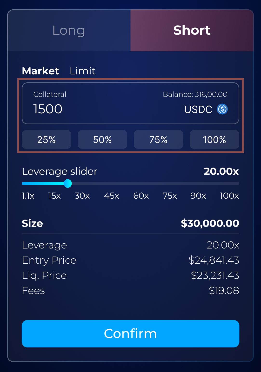 You can choose to enter your collateral in USD or as a percentage of your total wallet balance using the buttons below: 25%, 50%, 75%, or 100%.