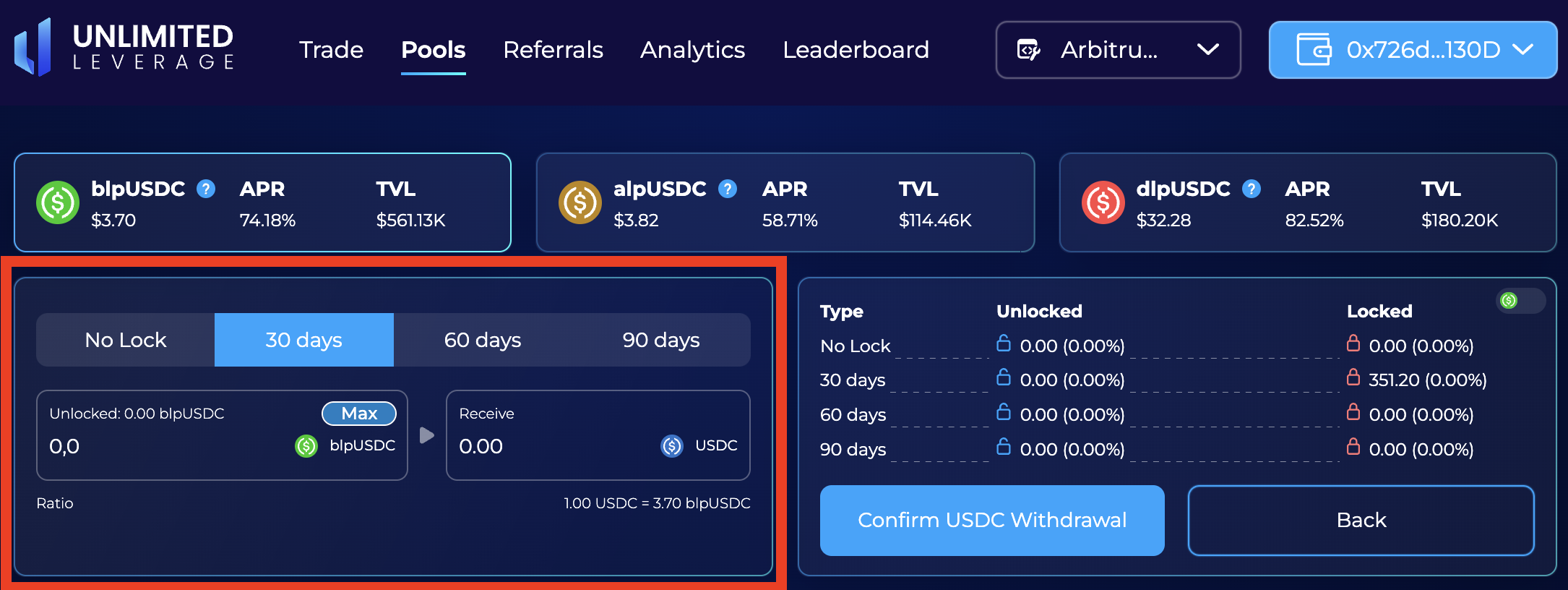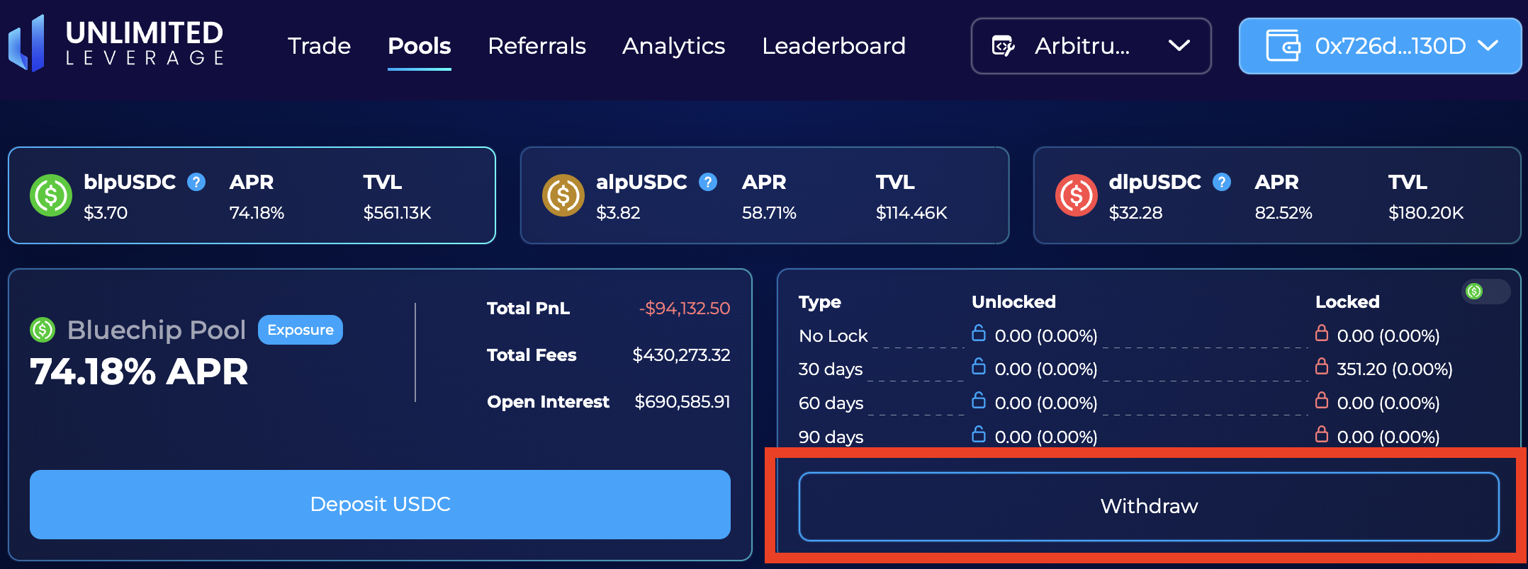 1. **To withdraw** funds from a liquidity pool, please select the <mark style="color:blue;">**"Withdraw"**</mark> button on <mark style="color:blue;">**the pool of your choosing.**</mark>&#x20;
