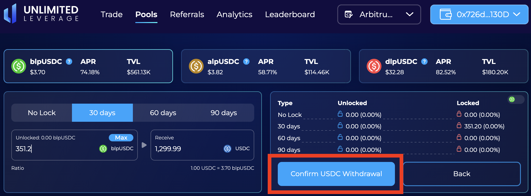 2. **Continue** by selecting the <mark style="color:blue;">**amount**</mark> from the <mark style="color:blue;">**aggregate of eligible positions**</mark> from which you can <mark style="color:blue;">**withdraw**</mark>. Click <mark style="color:blue;">**"Confirm USDC Withdrawal"**</mark> to finalize.